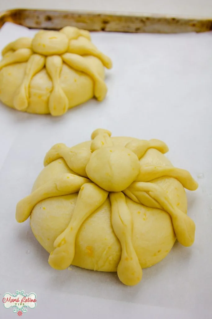 - Toma uno de los “huesitos” estira un poco el centro y colócalo transversalmente sobre el pan, cuidadosamente jala los dos extremos para que se estiren y ocupen todo el diámetro del pan de lado a lado. Casi hasta que toquen la charola.