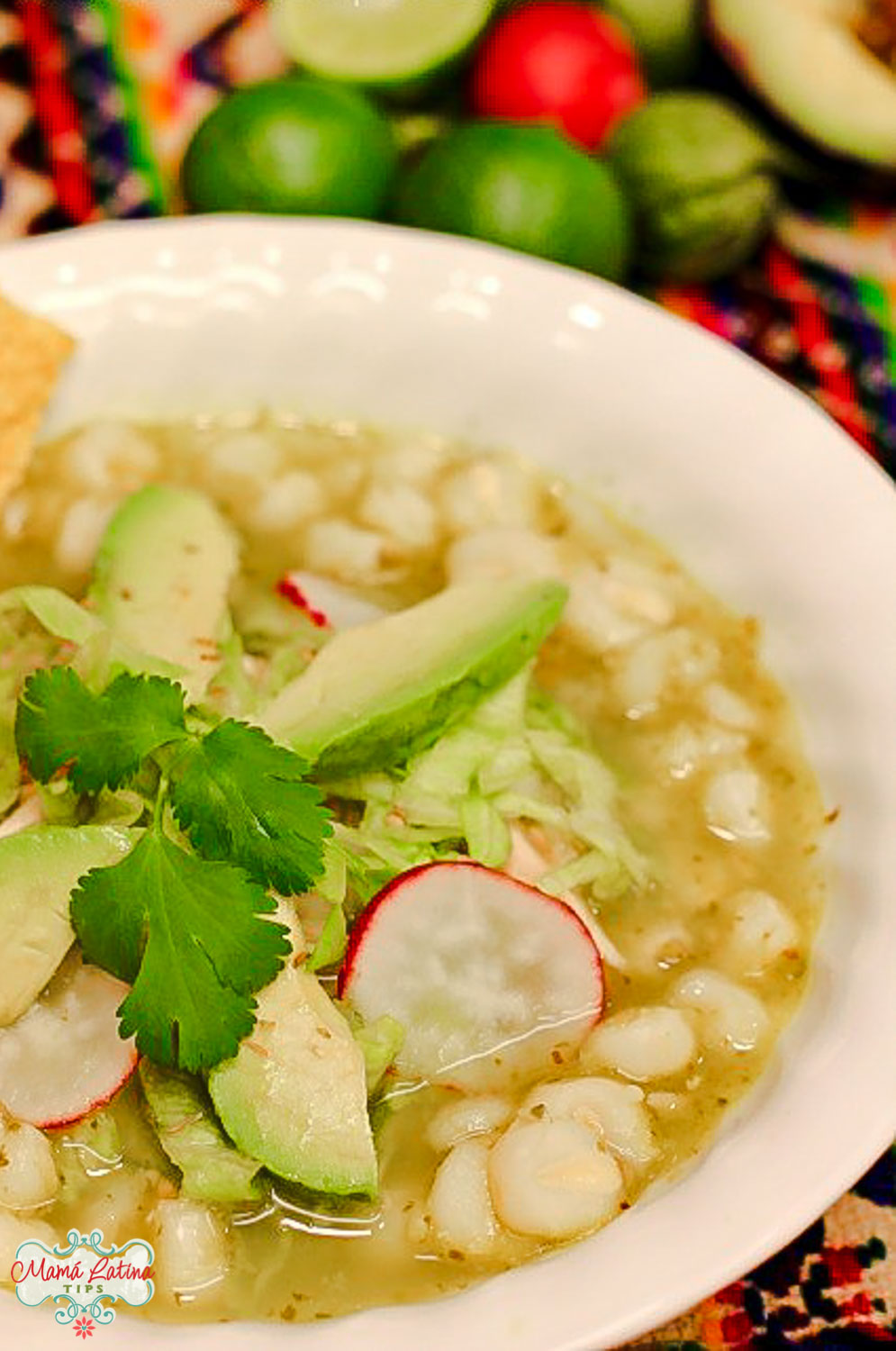 El pozole verde de pollo es un antojito mexicano muy popular. Es una especie de sopa hecha con pollo, maíz pozolero, salsa verde y especias.